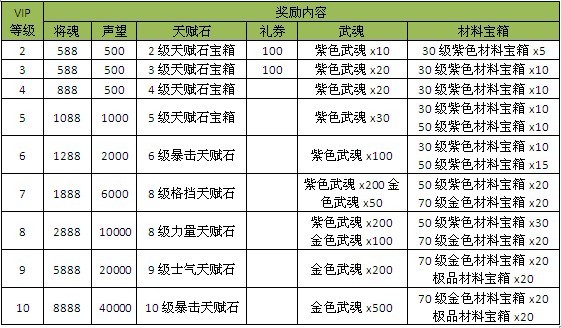 礼包内容:军令x10、将魂x188、银币x20万、蓝色武魂x20、礼券x100