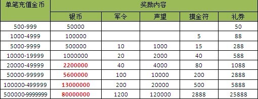 活动内容:活动时间内,单笔充值订单充值金额满足以下条件即可获得相应礼包一份,多次充值可以多次领取奖励!