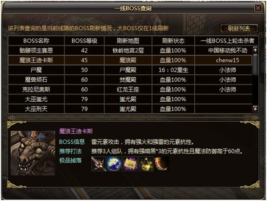 在这里可以清晰的查询到BOSS等级、刷新地图、刷新状态和上轮击杀者。也可以查看BOSS掉落等,为玩家刷BOSS提供了更好信息查询。