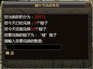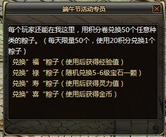 每个玩家还能在端午节活动专员处,用积分卷兑换任意种类的粽子(每人每天限量50个),可自主选择需要的粽子和种类;20积分兑换1个粽子(绑定)。