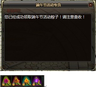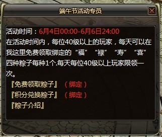 在活动期间,每位40级以上的玩家,每天可以在Npc处免费领取绑定的“福”“禄”“寿”“喜”四种粽子每种1个(每天每位40级以上玩家限领一次)。