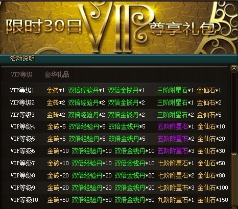 【活动内容】:活动时间内,VIP等级达到指定等级即可获得相应的VIP礼包奖励,礼包内含获得极品橙色装备的道具,享受与其他人不一样的特权,精彩无法错过!