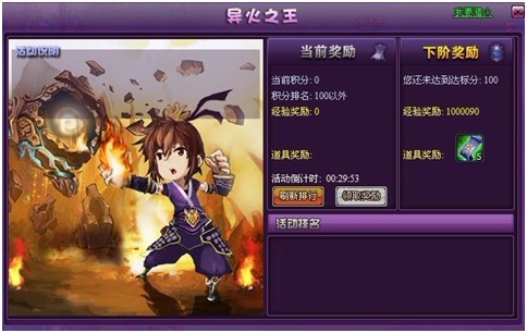 这是考较玩家获取异火的活动,按从系统获得异火多少来对应积分,达到达标积分之上的排位即可领取奖励。