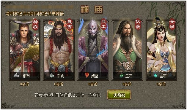 3、通过祭祀可以获得银币、军功、威望、玉石、宝石,活动期间效果翻倍!