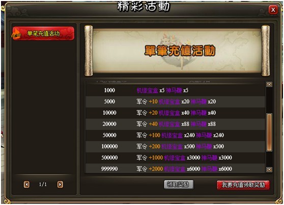 单笔充值活动开始啦!我们为您准备了丰厚的特供大礼包,不限量放送,只要你达到条件,礼包马上拿到手!走过路过千万不要错过!