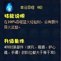 幸运吞噬:在100%吞噬蓝火经验时,会有额外异火奖励。(注:随机奖励1个1级绿火或1级蓝火)