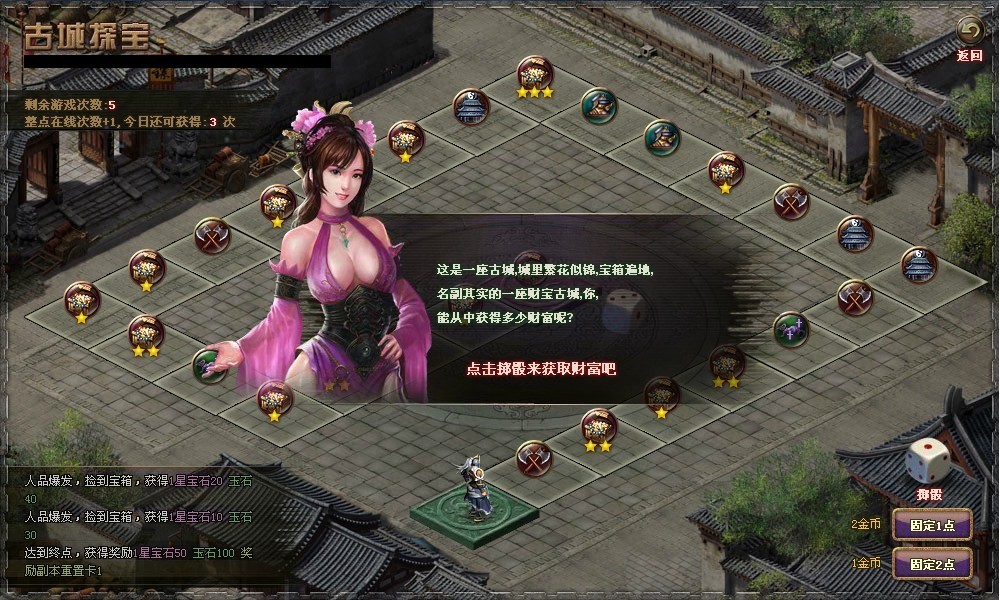 玩家在活动中可通过掷色子来决定自己的行动步数,每走一次都会有可能触发各种事件,如此循环探索惊险与机遇并存的神秘古城,最终将有几率获得传说中的奖励副本重置令。