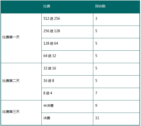 9轮淘汰制比赛,每轮有多场回合,回合数会根据轮次上升。详见表1日程安排。