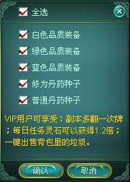 三、通宵挂机打怪,一直是很多玩家玩游戏的一个习惯,但是每天起来一看满包裹的战利品,即高兴又纠结,一个个丢弃太过繁琐,于是拥有VIP的你享受了不一样的体验:一键出售包裹指定物品,省时省力,升级怎能缺少?