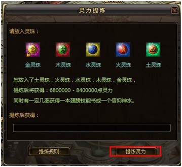 与魔力泉水NPC对话,投入五灵珠即可获得随机灵力值奖励,并且有一定几率获得翅膀技能书与信仰神水。投入的五灵珠的种类越多获得的灵力值越高,同时获得技能书与信仰神水的几率也越高。