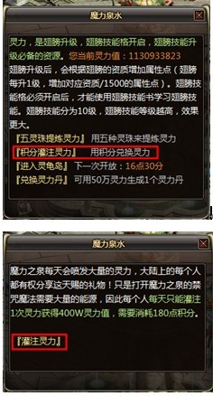 魔力泉水提供给每位玩家每天一次灌注灵力的机会,每次灌注400万灵力值,需要消耗180点积分。