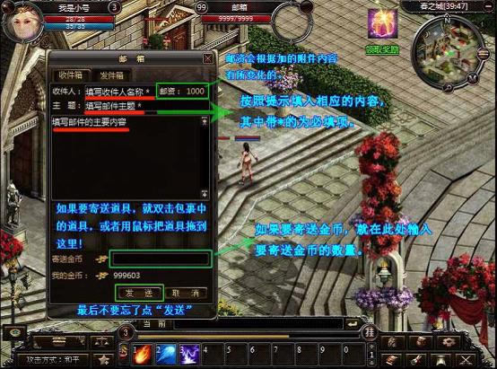 1.收发邮件都是在邮箱NPC处进行的。在华景村的(106,29)和春之城的(37,46)分别有一个邮箱NPC。
