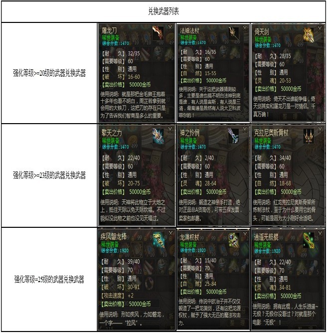 所有武器强化等级 〉=20的武器,可以在礼品兑换员处自选:屠龙刀,倚天剑,法神法杖中的一件.