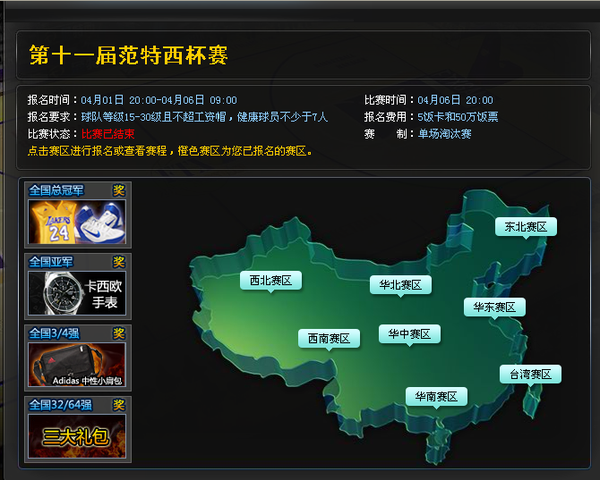 大赛总共分为8个区,每个区可以报名32个人,也就是256人,当报名满后,每个赛区排出赛程,也就是谁对阵谁的。等每个赛区决出最后一个玩家的时候,在8个区决出的球队进行对战直至最后一名出来。