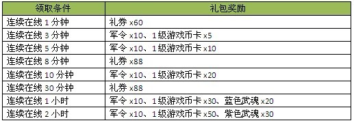 【活动内容】:活动期间,玩家单次连续在线满相应条件即可领取相应的礼包奖励