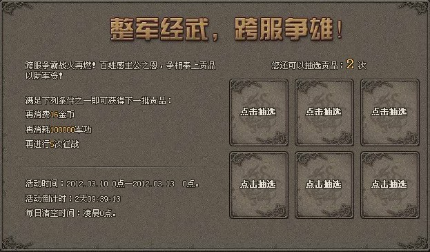 每获得一批贡品,您都能在六件中抽选其一,不仅有可能得到银币、金币、军令、军功、威望、突飞令中的一种,还有机会获得额外2倍、4倍、8倍暴击奖励 。